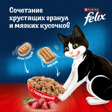 Любопытство Вашего кота заложено природой! И бренд FELIX® снова придумал, как его удовлетворить. Представляем FELIX® Двойная Вкуснятина® – сухой корм для кошек, который полностью соответствует потребностям Вашего озорника. Восхитительное сочетание двух текстур в одной упаковке: хрустящие гранулы смешаны с мягкими кусочками для создания невероятного вкуса, перед которым невозможно устоять! Широкий ассортимент позволит коту наслаждаться разнообразием мясных или рыбных вкусов с соблазнительными ароматами.