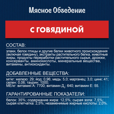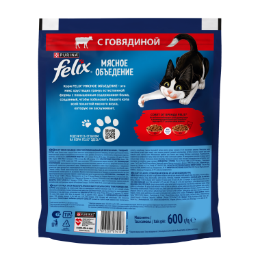 Корм Felix® Мясное объедение — это микс хрустящих гранул естественной формы с повышенным содержанием белка, созданный чтобы побаловать Вашего кота всей полнотой мясного вкуса, которую он заслуживает. Ваш пушистый озорник полюбит яркий вкус корма Felix® Мясное объедение, ведь он изготовлен без добавления искусственных красителей, ароматизаторов и консервантов! Ваш любимец также оценит сочетание мясных ингредиентов и овощей, ведь кошки так любят разнообразие в питании. И это еще не все! Корм Felix® Мясное объедение содержит оптимальное сочетание сбалансированных минеральных веществ и витаминов. Он на 100% удовлетворяет ежедневные потребности Вашего питомца в правильном питании. Пожалуйста, следуйте рекомендациям по кормлению, указанным на упаковке.