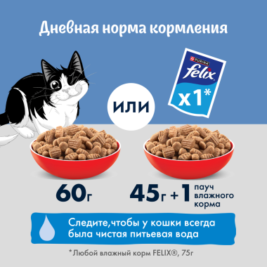 Для взрослой кошки среднего веса (4 кг) требуется 4 пакетика в день. Кормление желательно разделить минимум на два приема. Данные значения рассчитаны для кошек с умеренной активностью при нормальной температуре окружающей среды. Индивидуальные потребности кошки могут варьироваться, и ежедневное количество корма должно быть скорректировано по мере необходимости для поддержания оптимального веса Вашей кошки. Подавайте корм комнатной температуры. Следите, чтобы у Вашей кошки всегда была чистая, свежая питьевая вода.