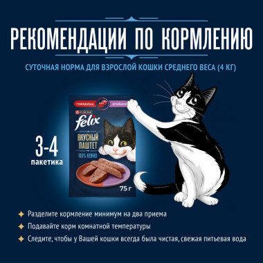 Для взрослой кошки среднего веса (4 кг) рекомендуется 3-4 пакетика в день. Кормление желательно разделить минимум на два приема.