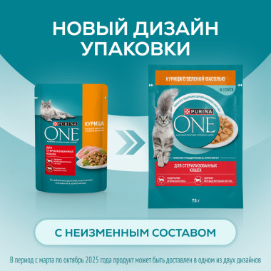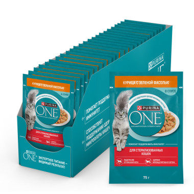 Влажный корм Purina ONE® для стерилизованных кошек и кастрированных котов, с курицей и зеленой фасолью, Пауч, 75 г