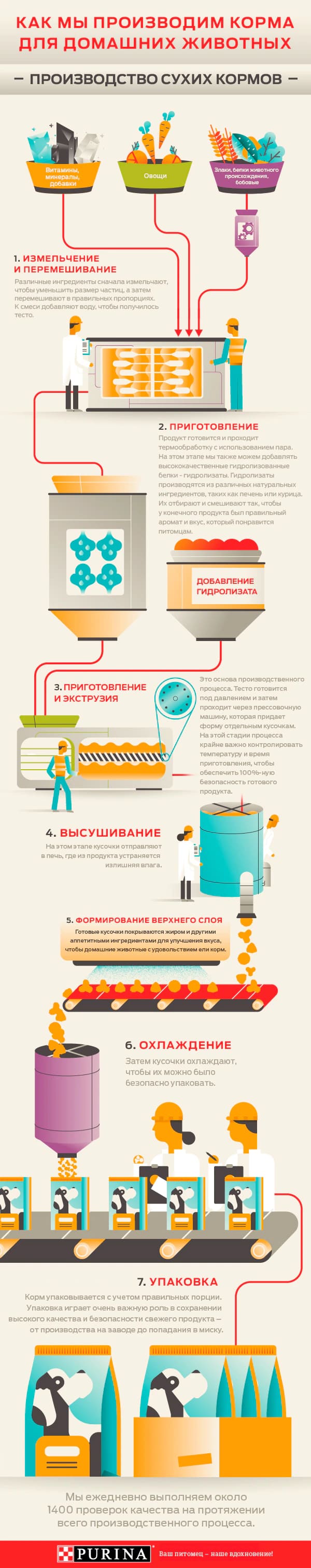 Для производства сухого корма для собак или кошек требуется семь этапов. Процесс начинается со смешивания в правильной пропорции высококачественных ингредиентов, необходимых для получения питомцем 100% полнорационного и сбалансированного питания. Далее из полученной смеси формируются и высушиваются кусочки, которые расфасовываются в упаковку высокого качества. Упаковка помогает поддерживать качество продукта на протяжении всего срока хранения.